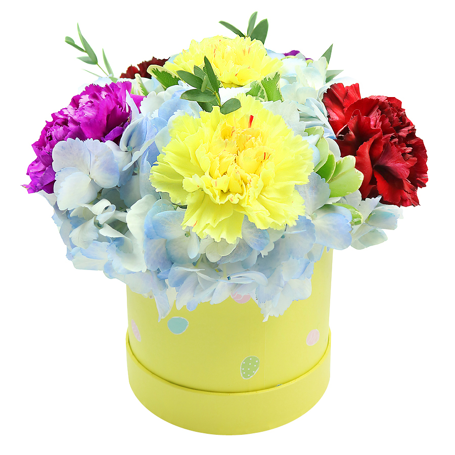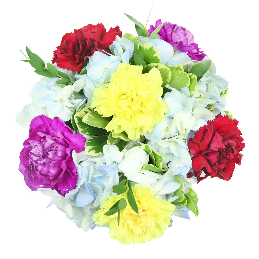 Experience a symphony of colors with our exquisite bouquet, featuring red, purple, and yellow carnations combined with blue hydrangeas and fresh greenery. Each flower is carefully hand-picked to ensure unmatched freshness and quality.